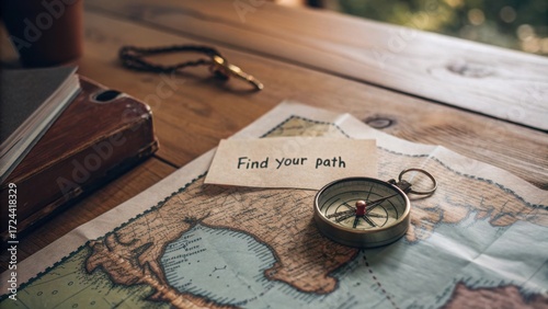 Vintage Compass on Map with Find Your Path Note, Symbolizing Adventure, Exploration, and Personal Journey
