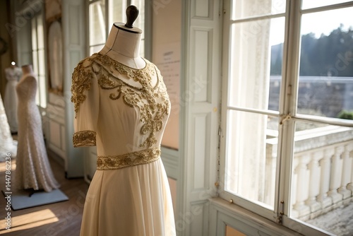 Vintage Cream Evening Gown with Golden Embroidery in Elegant Sunlit Setting