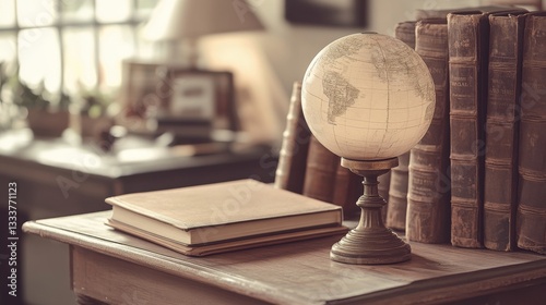 Vintage Desk Setup with Globe and Old Books in Cozy Room