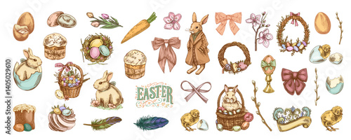 Vintage easter holiday hand drawn colored sketch illustration set in engraved style