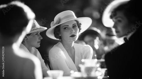 Vintage elegance: women in wide-brimmed hats at a retro tea party gathering
