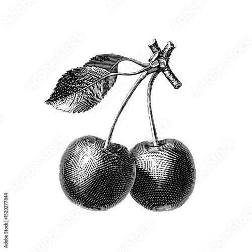 Vintage emblem featuring engraved illustration of cherry fruit with leaves, perfect for artistic design use in traditional settings