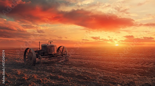 Vintage Farming Machine at Dusk, Nostalgic Horizon Under Fiery Skies