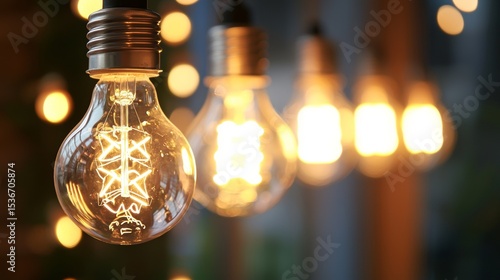 Vintage filament Edison bulbs hanging in row casting warm glow against dark industrial background scene