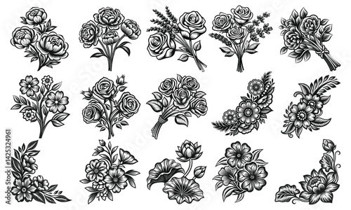 Vintage Floral Bouquets and Corner Designs in Black and White