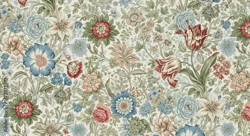 Vintage Floral Pattern with Blue Roses, Red Tulips, and Delicate