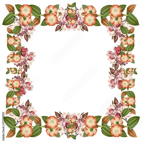 Vintage flowers on white isolated background vintage square frame with magnolia flowers