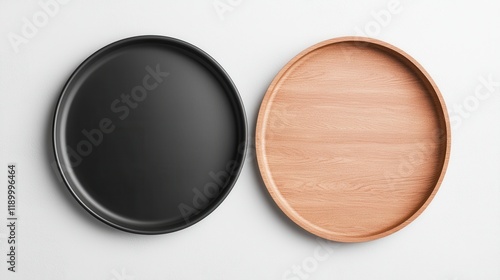 Vintage food packaging tray mock up concept. Two decorative trays, one black and one wooden, on a light background