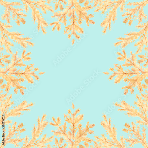 Vintage frame of golden pine branches on colorful background. Christmas card.