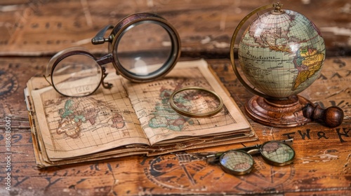 Vintage Globe, Magnifying Glass and Old Map.