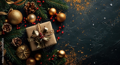 Vintage Gold Gift Box Top View on a Luxurious Dark Christmas Background