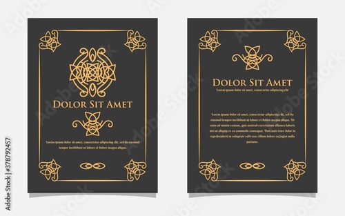 Vintage gold greeting card design with a black background. Luxury gold ornament template. For invitation, menu, wallpaper, brochure, decoration.