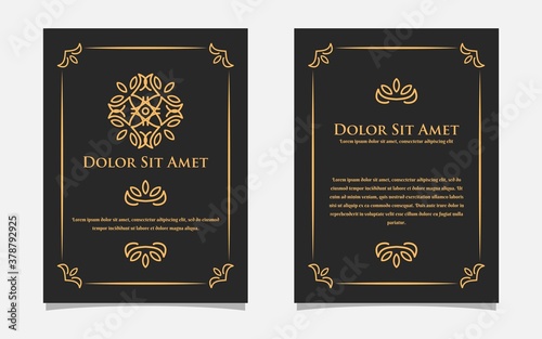 Vintage gold greeting card design with a black background. Luxury gold ornament template. For invitation, menu, wallpaper, brochure, decoration.