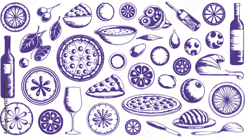 Vintage hand drawn pizza, wine, bread, citrus, and Italian food elements illustration set for restaurant menu or t shirt design