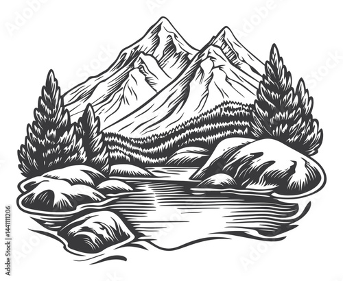 Vintage Hand-Drawn Illustration of Mountains and Scenic Landscape