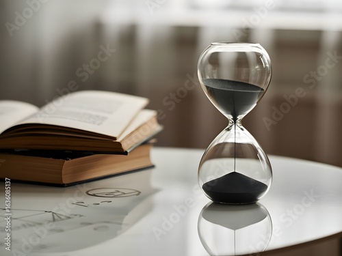 Vintage Hourglass with Red Wine Liquid, Books, and a Plant on a Desk. Time Management and Relaxation Concept.