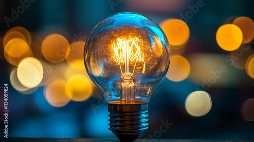Vintage incandescent light bulb with glowing filament illuminated against a colorful bokeh background featuring warm and cool tones