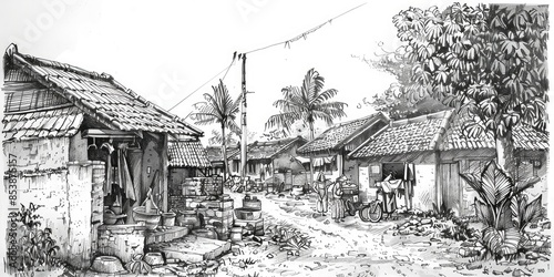 Vintage Japanese Village Street Drawing