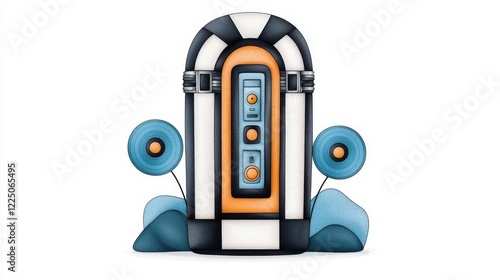 Vintage Jukebox with Bright Colors and Retro Design Surrounded by Stylized Shapes