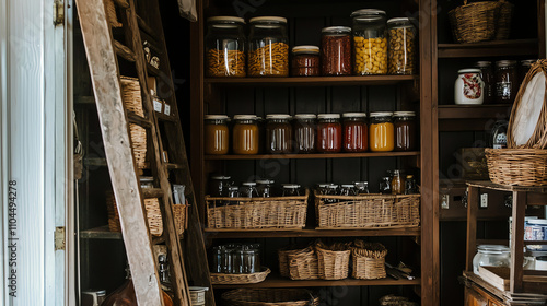Vintage kitchen pantry filled with glass jars and woven baskets showcasing preserved foods and ingredients
