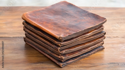 Vintage Leather Notebooks Stacked on Wooden Surface for Background