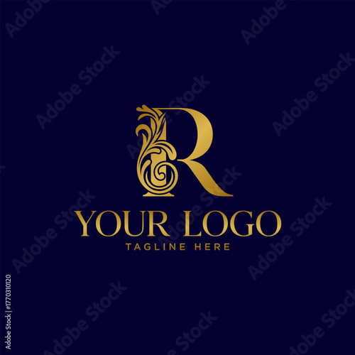 Vintage Letter R Logo with Ornamental Floral Design in Gold on Dark Blue Background
