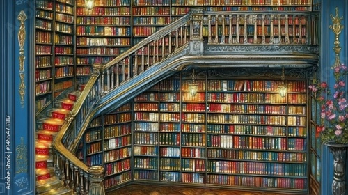 Vintage Library Interior Depicting Bookshelves Filled with Aged Volumes and a Spiral Staircase Leading to an Upper Level Reading Area Study