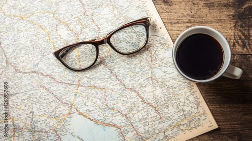 Vintage Map with Glasses and Coffee on Rustic Wooden Table