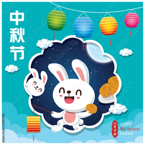 Vintage Mid Autumn Festival poster design with the rabbit character. Chinese translate: Mid Autumn Festival. Stamp: Fifteen of August.