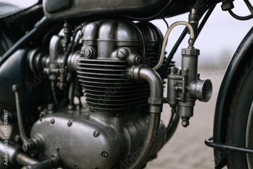 Vintage Motorcycle Engine Detail: Close-Up of a Classic Motorbike Mechanical Components, Chrome and Steel