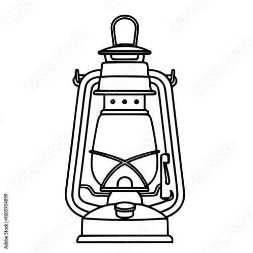 Vintage oil lantern with classic handle drawn in simple black and white outline style
