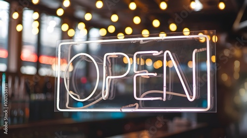 Vintage "Open" Neon Sign Inside Bar with Warm Bokeh Lights