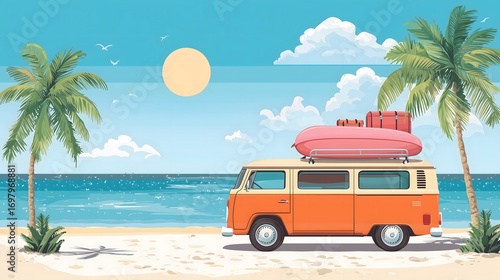 Vintage Orange Van Parked on Tropical Beach with Surfboard and Luggage