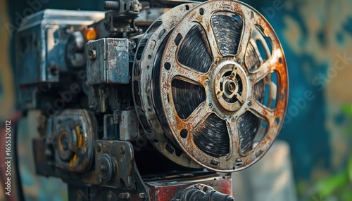 Vintage Outdoor Cinema Features Old Rusty Analog Rotary Film Movie Projector For A Retro Movie Watching Experience.
