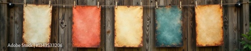 Vintage outdoor posters hanging from a wooden fence, outdoor decor, weathered wood