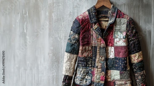 Vintage Patchwork Jacket Hanging on Rustic Wooden Hanger Against Gray Concrete Wall