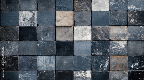 Vintage patchwork tiles featuring a dark anthracite stone and concrete texture creating a shabby and worn wall background