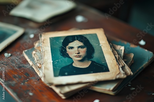 vintage photograph, A close-up of an old, faded photograph of a young girl with freckles, resting on a stack of dusty, worn-out photos. Faded Identity of the Past