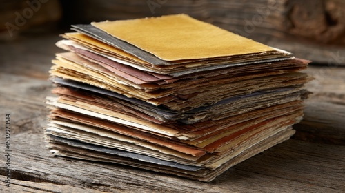 Vintage photograph stack topdown view aged curled yellowed paper nostalgic warm tones wooden surface subtle shadows copy space