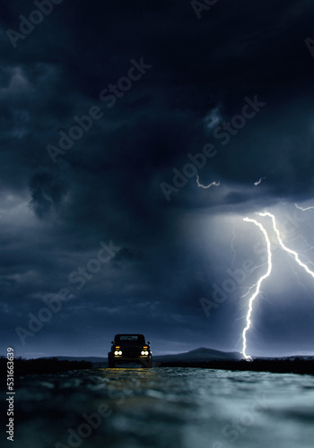 Vintage pickup truck with illuminated headlights on road in vast landscape under a dark sky with lightning. 3D render.