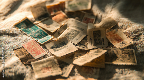 Vintage Postage Stamps Collection on Textured Fabric with Warm Lighting