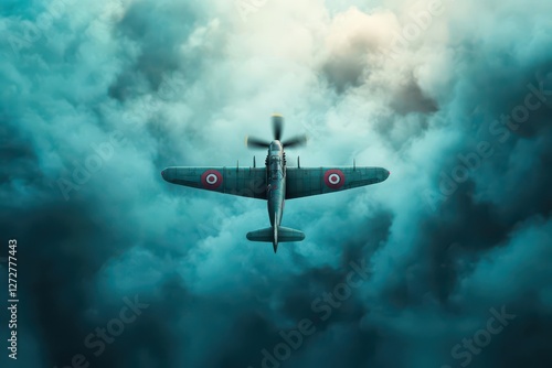 Vintage Propeller Warplane Flying in Dramatic Cloudy Sky in Teal Tones and Sunlight