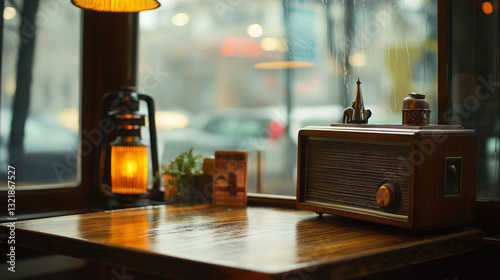 Vintage radio on a wooden table by a window. Rainy day atmosphere.
