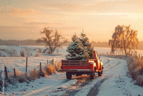 vintage red pickup truck hauling freshly cut pine tree, snowy rural road, warm golden sunset glow, festive holiday atmosphere