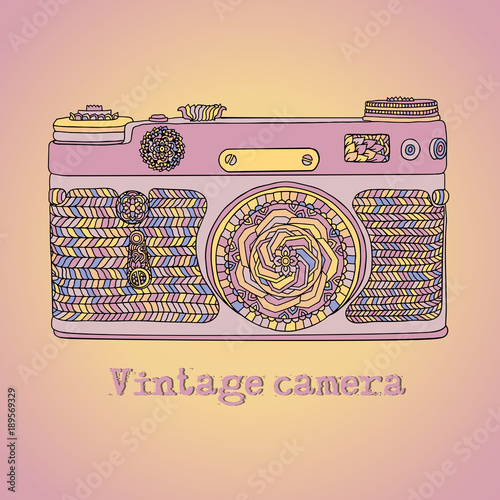 Vintage retro photo camera with leaves pattern. Mandala style design. Boho style vector illustration.