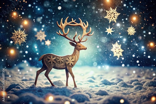 Vintage Retro Style Long Exposure of Christmas Paper Cut Deer Surrounded by Snowflakes and Stars in a Polar Night Setting
