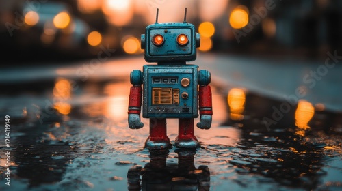 Vintage Robot Toy in Urban Setting during Golden Hour Reflection