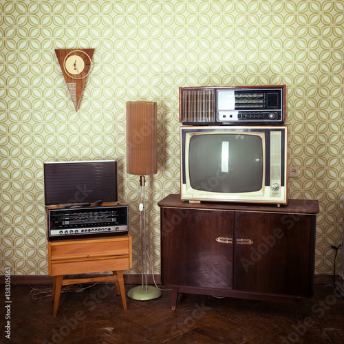 Vintage room with wallpaper, tv, old fashioned armchair, retro player, loudspeakers, clocks and standart lamp, toned