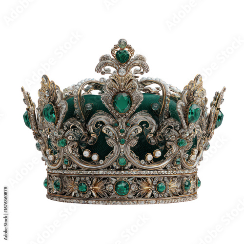 Vintage royal crown with intricate metal details and emeralds on transparent background