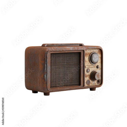 Vintage rusty radio with knobs and mesh front reflects nostalgic design and aged metal finish